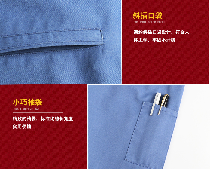 也有的企業會在左衣袖上加一個臂袋,衣袖上的臂袋是考慮在工作時做一些記錄時要用的筆拿取方便,另外還可以根據工作需要多做或少做一些口袋,這主要根據各企業的工作環境和要求制作。