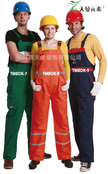 • 產品簡介:TMBDK-07: 面料:滌棉 20*16,120*60,235-245 gsm;一個胸兜帶有5號隱藏式塑脂拉鏈;前門襟塑脂拉鏈, 兩個斜插褲兜,腿部工具兜,腰部可以調節松緊,背帶松緊帶并有卡扣可以調節長短。TMBDK-08:面料:滌棉 16*12,108*56,260-270 gsm;一個帶蓋胸兜;前門襟塑脂拉鏈, 兩個斜插褲兜,腰部可以調節松緊,背帶松緊帶并有卡扣可以調節長短,一條3CM反光條在胸部外另有兩條環繞褲腿一周。